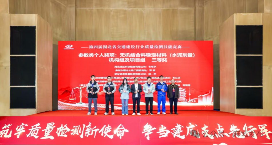此次竞赛中,该站参赛选手袁响利、汪庆晨、罗颖、杨敏敏、李莹凭借扎实的理论基础,顺利通过初赛理论考试,全员晋级决赛。决赛环节,选手们展现出精湛专业技能,其中罗颖发挥突出,成功夺得 “机构组无机结合料稳定材料 (水泥剂量) 参数个人三等奖”,充分彰显了团队高水平职业素养。