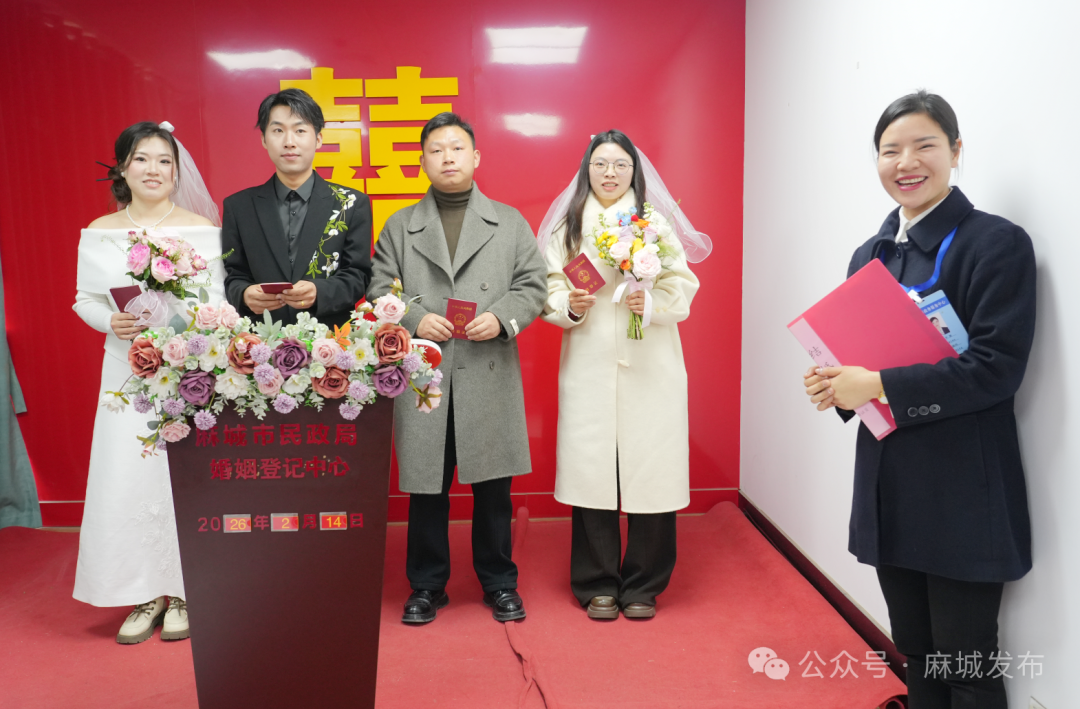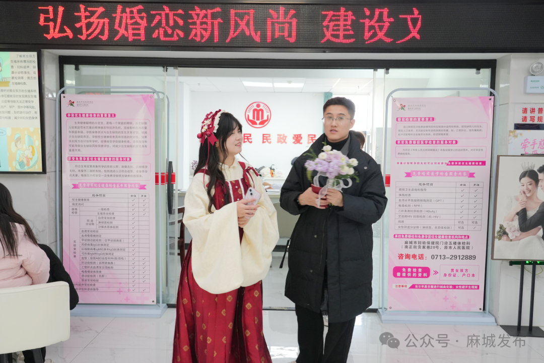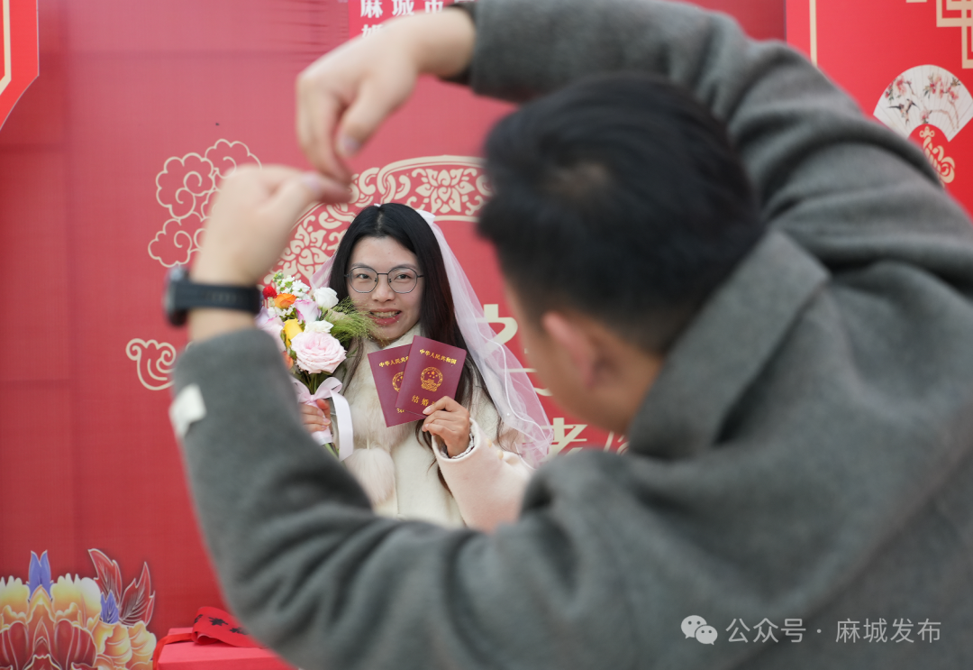 为应对登记高峰,麻城民政部门提前在“鄂汇办”平台开放预约通道,增派人员并延长服务时间,确保即来即办。现场还精心准备打卡墙、婚纱、捧花、鲜花等氛围道具,为新人营造温馨浪漫的登记体验。同时,现场通过海报等形式开展“倡导文明婚俗,弘扬时代新风”主题宣传。市妇幼保健院提供免费婚检服务,政务服务中心志愿者全程引导,保障新人享受便捷、温暖的一站式登记服务,顺利领取象征幸福的“红本本”。