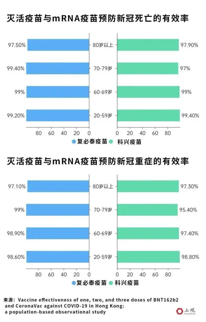 甚至在部分年龄段上,灭活疫苗的有效率优于mRNA疫苗。例如,在针对80岁以上人群而言,在灭活疫苗在预防重症与死亡的有效率上都高于mRNA疫苗。