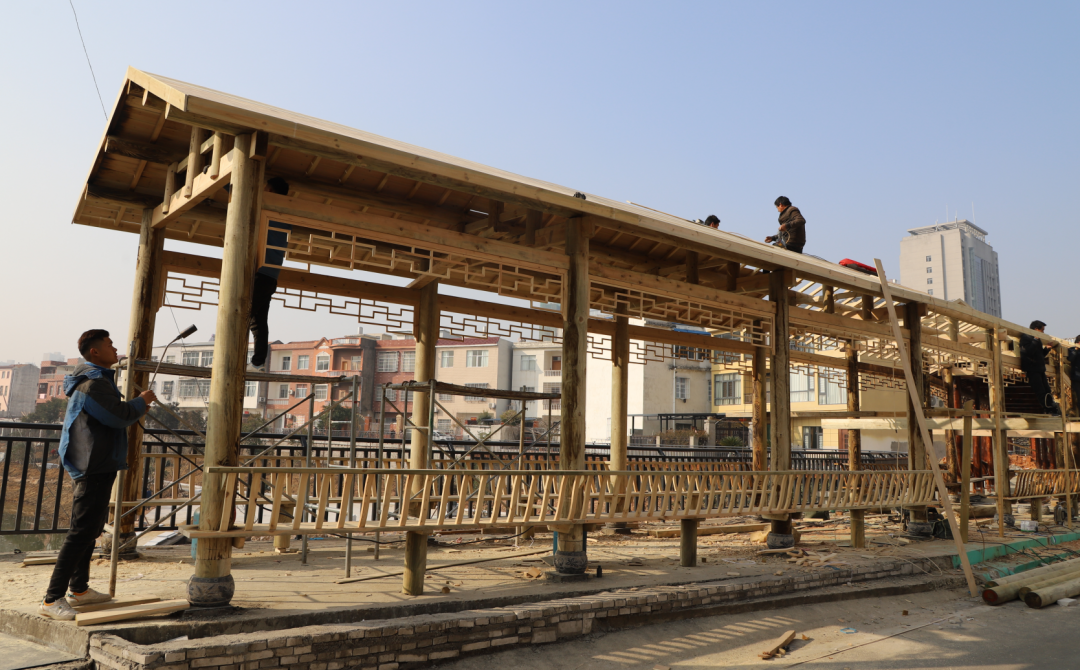 2022年12月下旬,天气日渐寒冷,但在万家堰社区张家院子共同缔造项目建设现场却依旧热度不减。大批施工人员正加班加点赶进度,搭建仿古长廊、栽植绿化苗木、修砌人工湖石岸,呈现出一派热火朝天的忙碌景象,社区公园主体轮廓已基本成型。