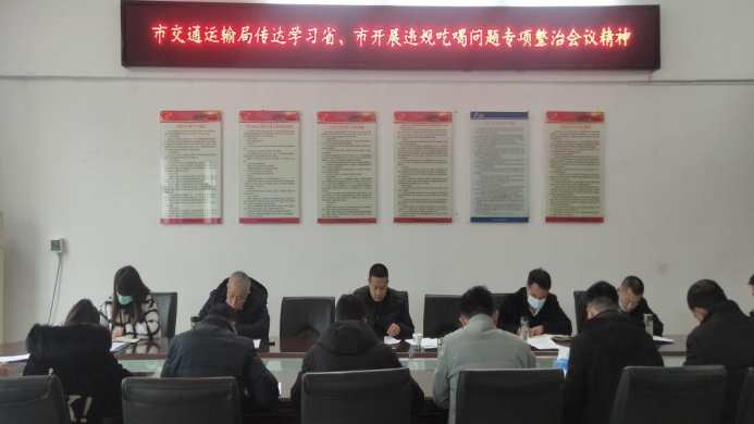 1月12日,市交通运输局召开党组扩大会,传达学习全市违规吃喝问题专项整治动员部署会会议精神。会议强调,要深入贯彻落实会议精神,紧紧围绕市委、市政府的决策部署,坚决防止“四风”反弹回潮,切实遏制各种违规违纪现象,推动构建清清爽爽的同志关系、亲清的政商关系。要高度重视违规吃喝问题专项整治工作,紧绷思想之弦,深入开展自查自纠;要建章立制,对公务接待、公车管理等重点方面加强制度管理,严格按照标准不折不扣执行。