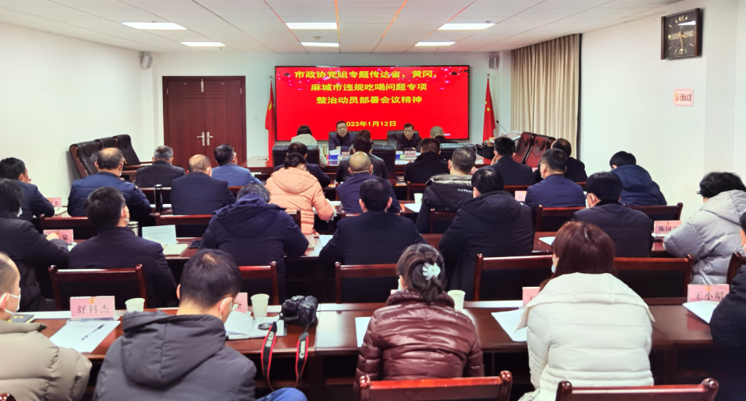 1月12日,市政协机关召开违规吃喝问题专项整治动员部署会,传达学习省、黄冈市、麻城市违规吃喝问题专项整治动员部署会议精神,安排部署违规吃喝问题专项整治工作,坚决杜绝违规吃喝问题发生。市政协副主席凌建平、项双能、肖昶、葛娅参加会议。