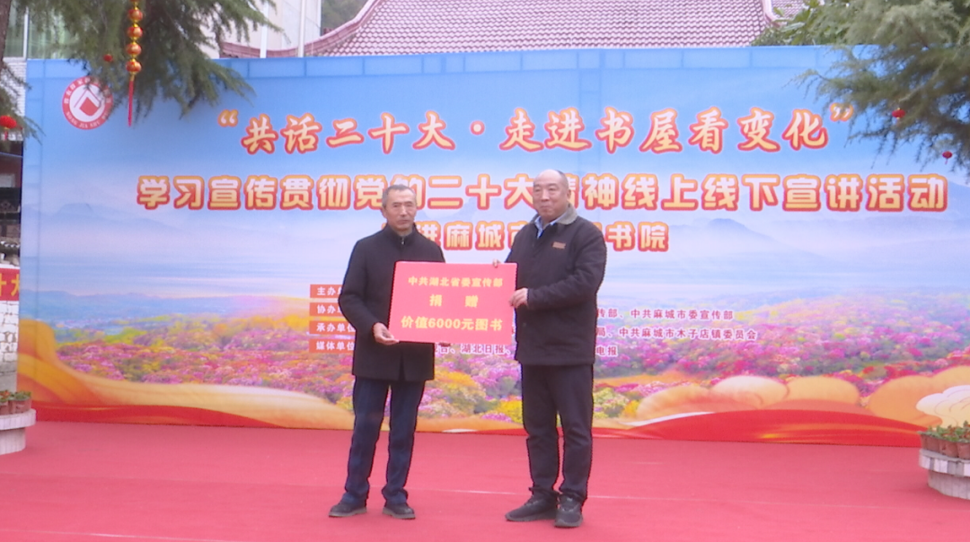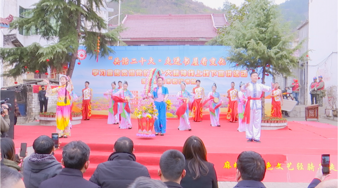 活动现场,省委宣传部向细石岭村后山书院捐赠价值6000元的图书。麻城民俗歌舞《米酒飘香敬亲人》、湖北道情《欢庆二十大喜洋洋》、麻城花挑《礼赞二十大》等文艺节目轮番上演,以老百姓喜闻乐见的方式宣传党的二十大精神。学生、村民代表分别讲述《我与后山书院的故事》和《后山书院带来的变化》,表达他们对后山书院未来发展远景以及幸福生活充满希望。