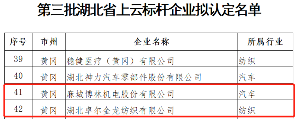 近日,省经信厅公示第三批50家湖北省上云标杆企业,其中黄冈4家,我市卓尔纺织和博林机电2家企业入选,这是我市首次入选此项目,实现了省级“云上标杆企业”零的突破。