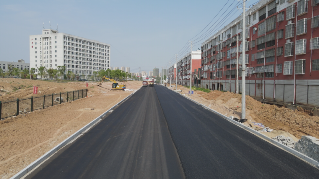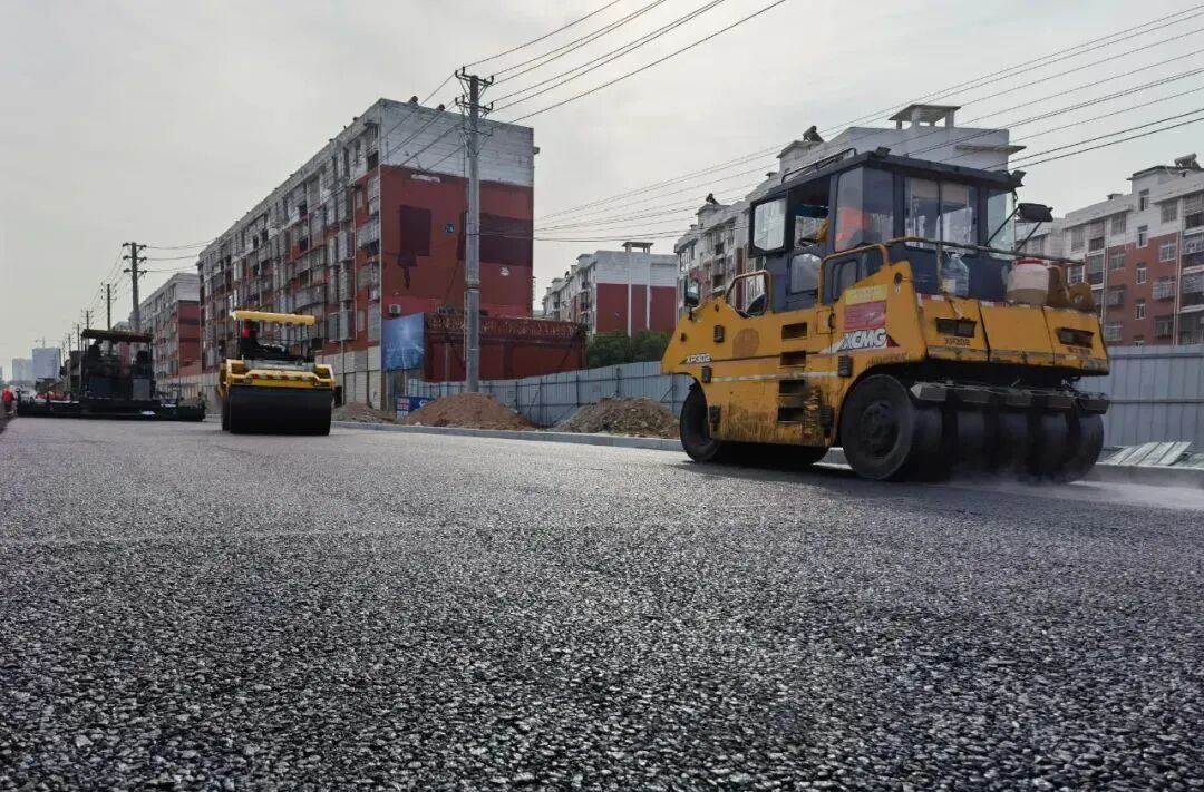在施工现场,工人们正抓紧施工,工程车辆来回压实,经过数小时连续作业,一条平坦“黝黑”的柏油大道呈现眼前。