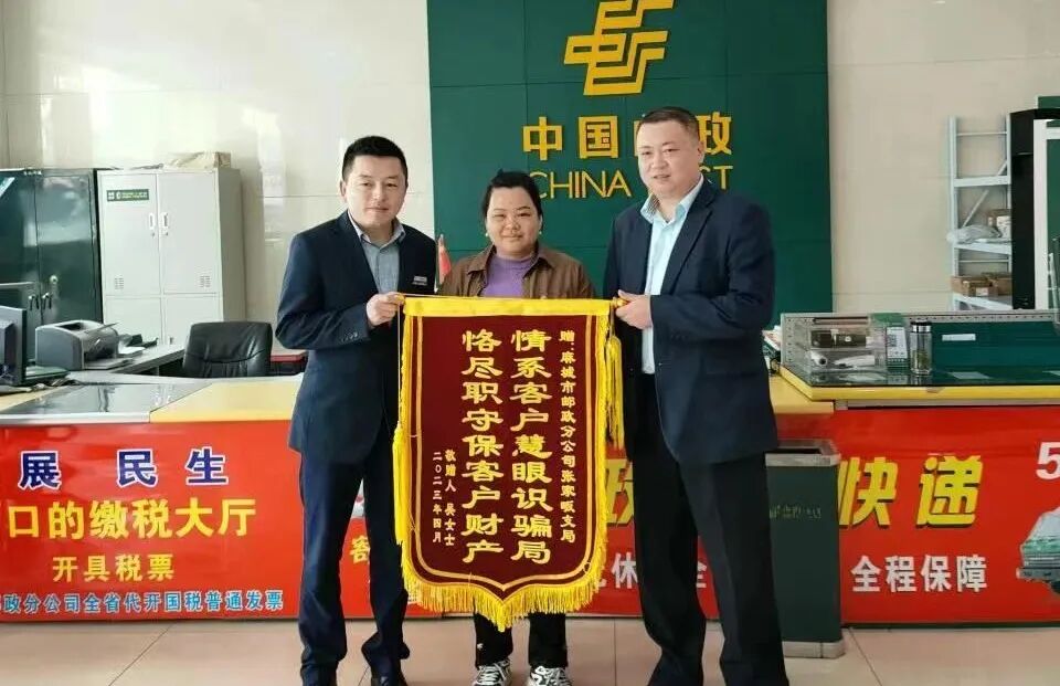4月11日清早,吴女士来到麻城邮政张家畈支局,向工作人员送上一面红彤彤的锦旗,感谢他们及时制止了自己遭遇的电信诈骗,守住了自己的血汗钱。