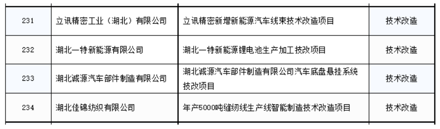根据湖北省经济和信息化厅最新发布的《关于2023年度省级制造业高质量发展第一批专项新立项项目名单的公示》,我市立讯精密工业(湖北)有限公司、湖北诚源汽车部件制造有限公司、湖北佳锦纺织有限公司、湖北一特新能源有限公司成功入选并通过公示。