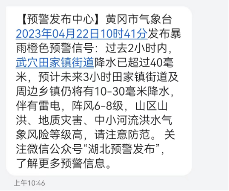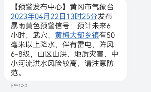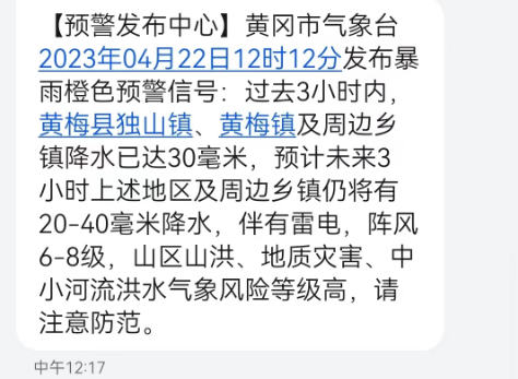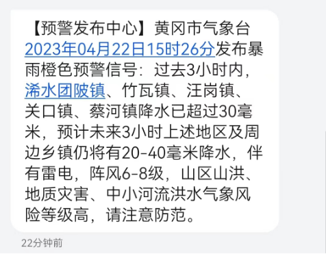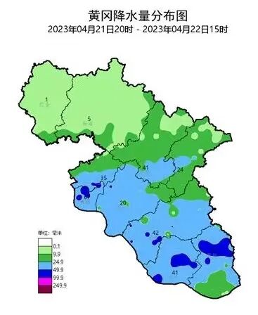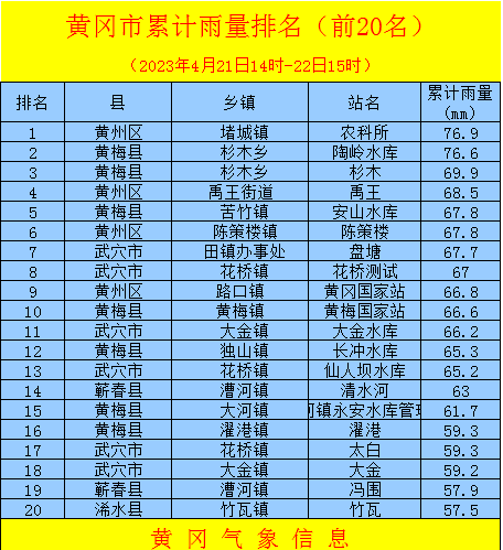 全市气象观测站有:29站暴雨、66站大雨、65站中雨、79站小雨。雨量较大的有:黄州农科所76.9、黄梅陶岭水库76.6、黄梅杉木69.9、黄州禹王68.5、黄州陈策楼67.8、黄梅安山水库67.8、武穴盘塘67.7、武穴花桥测试67.0、黄州黄冈国家站66.8毫米。小时雨强较大的有:30.6毫米(陶岭水库,22日15时)、30.1毫米(杉木,22日15时)、29.3毫米(大河镇永安水库管理处,22日14时)。上午降水主要集中在黄州、武穴、黄梅等中南部地区。