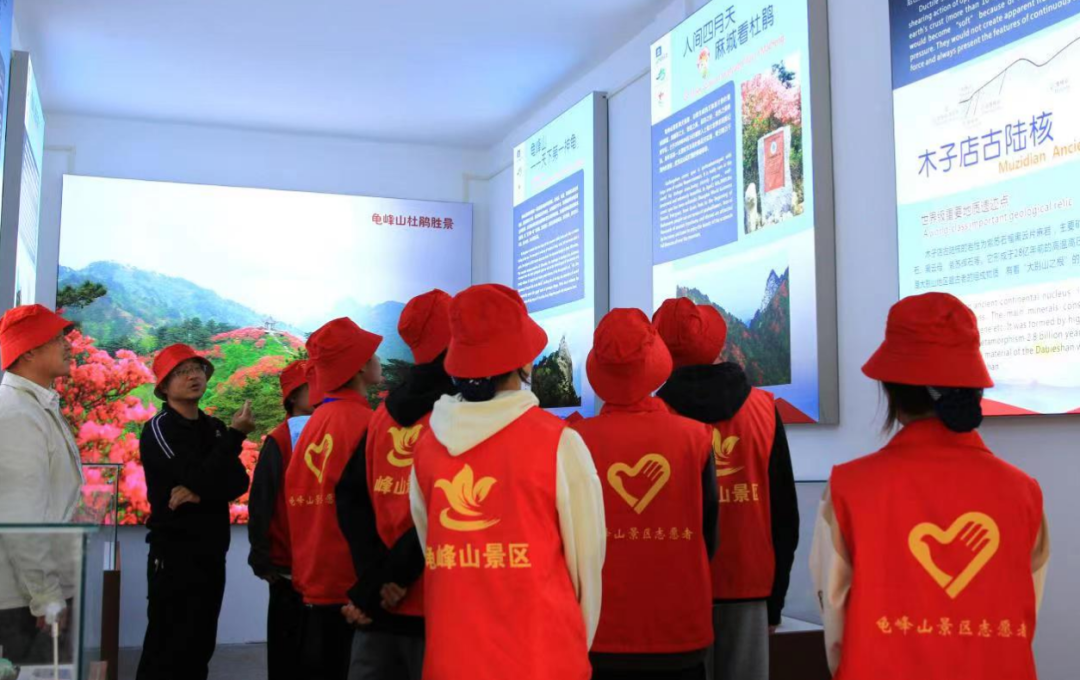 在龟峰山脚下,新建的地质科普馆一开门,就迎来大批的游客,小朋友在工作人员的讲解下,好奇地了解大别山神奇的古陆核地质遗迹、地质风貌的由来,观察各种化石和矿石标本,增强保护地球的环境意识。
