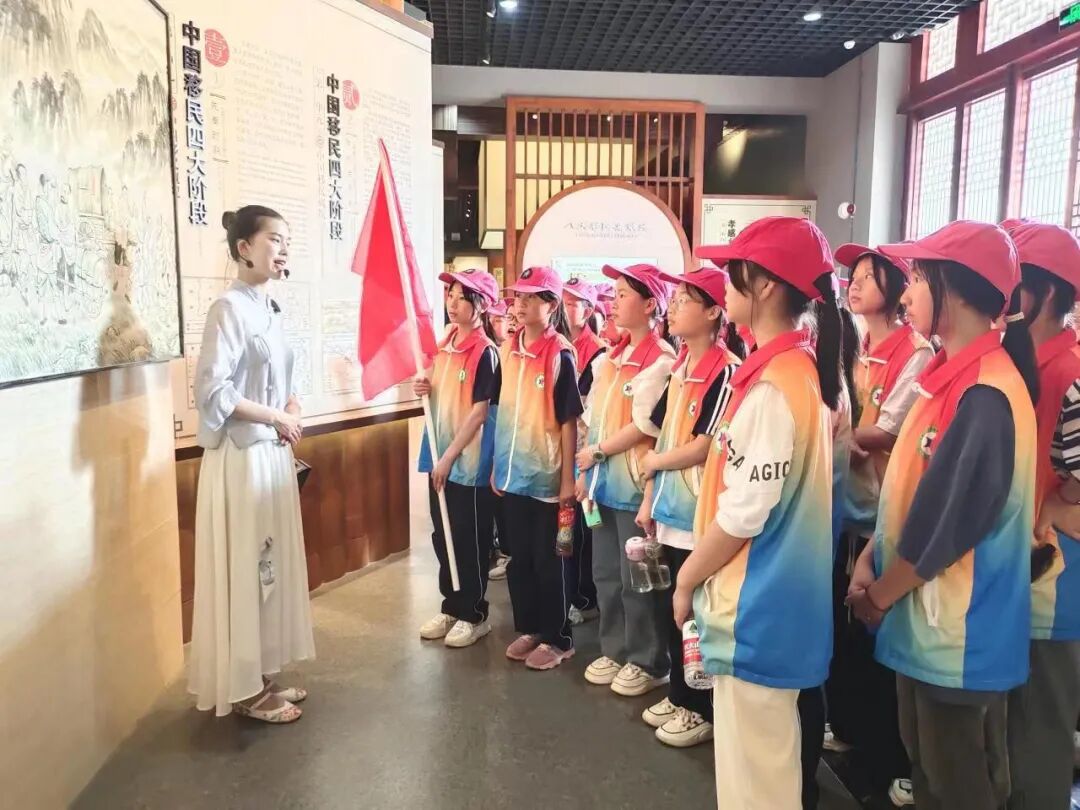 研学活动中,学生们在讲解员的带领下,沿着移民文化轴游览了入口门楼、麻邑四乡壇域图印章、祭祀斗旗坊、祭祖大殿、谱堂、环宇尊亲坊等景点。在移民博物馆,展区采用3D的方式还原移民先辈们迁徙的一个个场景。沉浸式的体验,让同学们读懂了祖辈们千里迢迢,背井离乡,受命西进的艰辛与苍凉,一种敬畏之情油然而生。