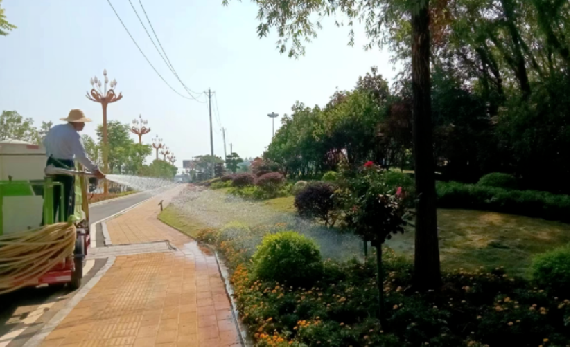 浇水抗旱。科学合理安排浇水时间,采取洒水车、人工相结合的方式开展绿化植物浇水工作。重点针对今年开春以来新栽植的樟树、法桐等1693棵大乔木,紫薇、桂花、樱花等1575棵小乔木,红花檵木、红叶石楠等12万余株灌木,1.7万余平米草皮,1.3万余平米时令鲜花,做到定点、定时进行喷灌。保证浇水质量,浇足浇透,不留死角,确保新植苗木成活率。