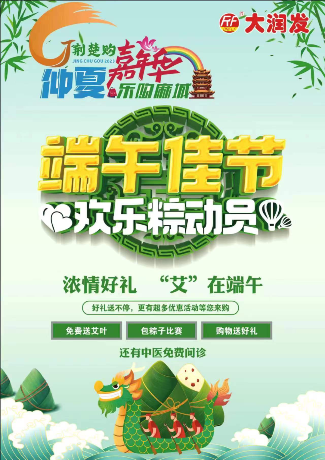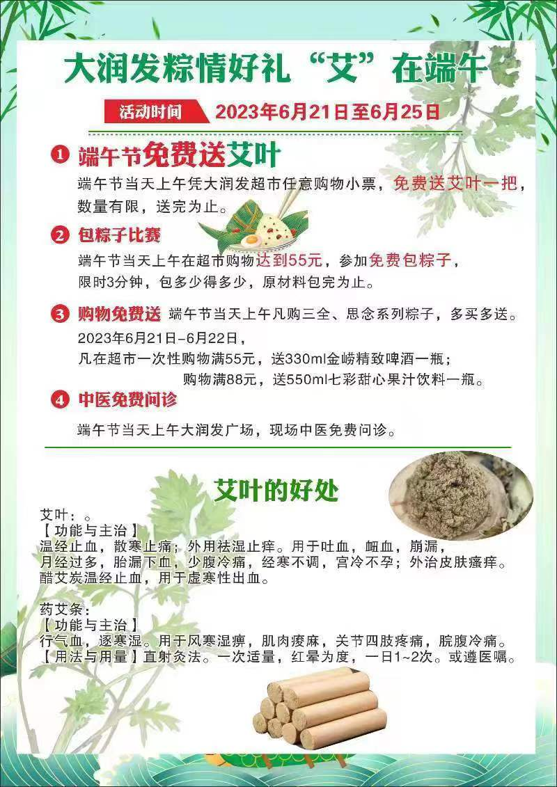 内容:端午节当天凭大润发超市任意购物小票,免费送艾叶一把,数量有限,送完为止;超市购物达到55元,参加免费包粽子,限时3分钟,包多少得多少,原材料包完为止;现场中医免费问诊。