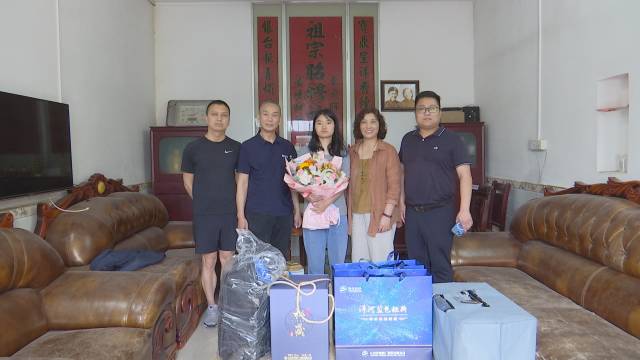 6月25日,江苏洋河酒厂股份有限公司黄冈北办事处、麻城市海韵商贸中心一行看望高考优秀学子董怡以及她的家人,并送上鲜花、行李箱、背包等爱心礼品。