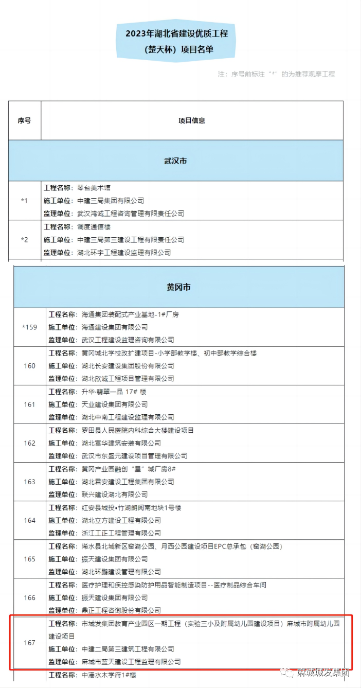 经省建设工程质量安全协会组织评选,琴台美术馆、国网湖北省电力有限公司调度通信楼、麻城市城发集团教育产业园区一期工程(实验三小及附属幼儿园建设项目)等197项工程荣获2023年湖北省建设优质工程(楚天杯)。近日,省住建厅发文对获奖工程的承建单位和监理单位给予了通报。