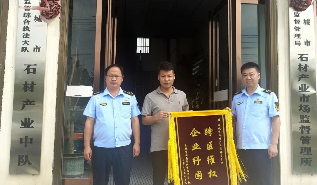 9月15日,麻城市闽南石业有限公司负责人余先生来到石材产业园市场监管所,将一面“跨区维权、企业纾困”的锦旗送到工作人员手中,以表达对石材产业园市场监管所帮助企业跨地区维权,为企业挽回经济损失的感谢之情。