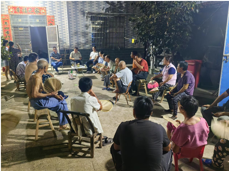 9月18日,夜幕刚降临,谭程村洪宇塆村民提着小电扇、摇着大蒲扇匆匆奔向李文高家院子参加共同缔造塆组会。