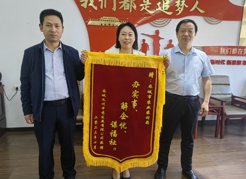 10月19日,麻城九州中药发展有限公司为麻城市农业农村局送来了“办实事、解企忧、谋福祉”的锦旗,对市农业农村局给予公司的大力支持和指导表达谢意。