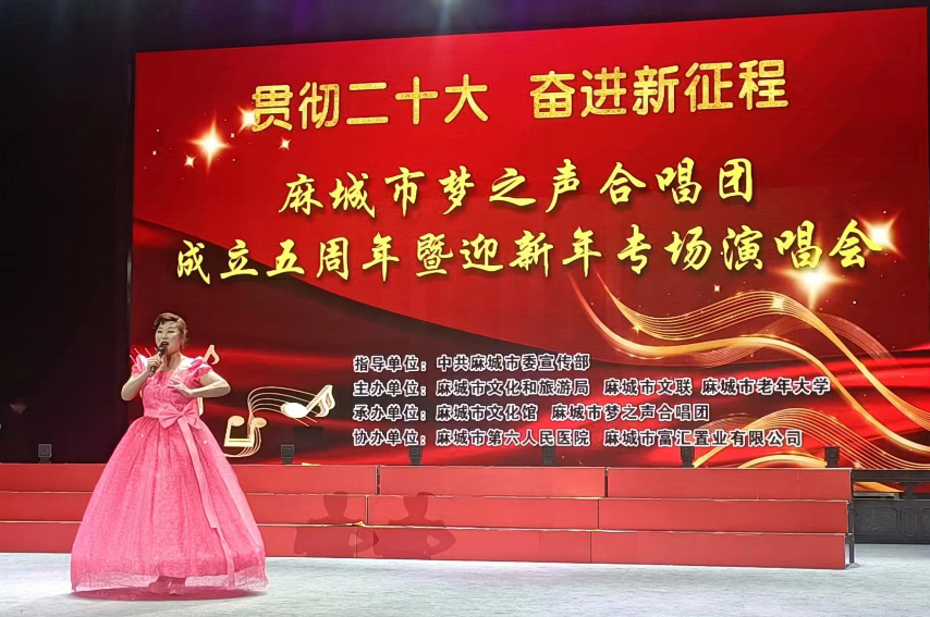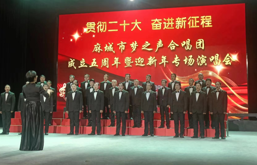 12月16日,麻城市举办“贯彻二十大,奋进新行程”迎新年暨梦之声合唱团成立五周年专场演唱会。本次歌咏会以“贯彻二十大,奋进新行程”为主题,通过舞蹈、朗诵、大合唱等多种文艺形式,表达了对党和伟大祖国的美好祝福。