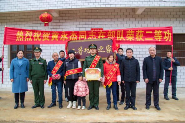 “老黄家又添了一块‘二等功’牌匾!”3月6日,夫子河镇锣鼓喧天、热闹非凡——在第81集团军某旅担任连长的黄永杰,不久前再次荣立个人二等功。当天一早,市委常委、人武部长王连山带领市人武部、市退役军人事务局、夫子河镇一同将喜报牌匾送到了黄永杰家中。