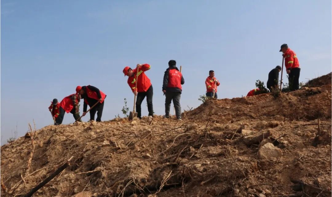 镇党委班子成员与镇干部职工、志愿者、龙井村党员群众们一道共植新绿,大家挥锹刨坑、扶苗培土、提水浇灌、平整踩实,干劲十足……