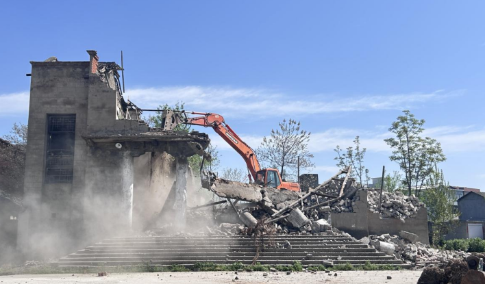 4月9日,中馆驿镇出动大型勾臂挖掘机1台、转运车辆3台,对镇区1处历史性大型危房进行拆除,一次性拆除危房面积3800㎡。