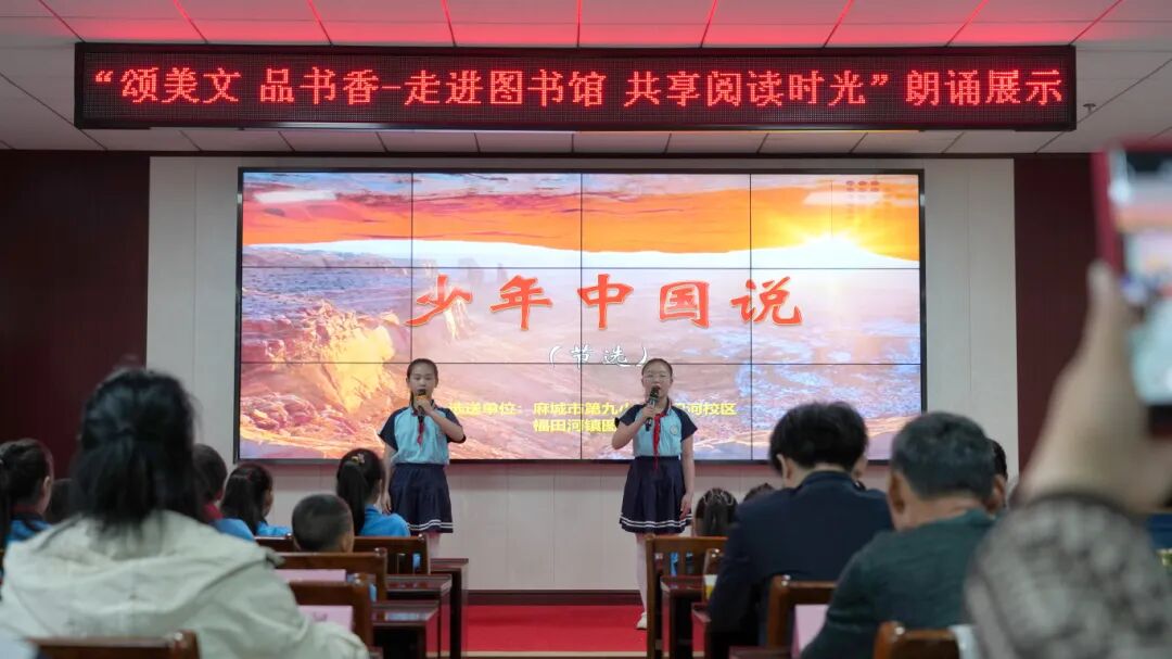 市级小学组、市级高中组以及省级高中组的获奖征文作者代表们,用真挚的情感和生动的语言,将作品中的故事和情感娓娓道来,让在场的每一位观众都感受到了文字的力量和阅读的魅力。第九小学福田河校区和福田河图书馆分馆选送的朗诵作品《少年中国说(节选)》更是将现场气氛推向了高潮。孩子们用稚嫩而坚定的声音,诵读着这篇充满爱国情怀的经典之作,赢得了在场观众的阵阵掌声。