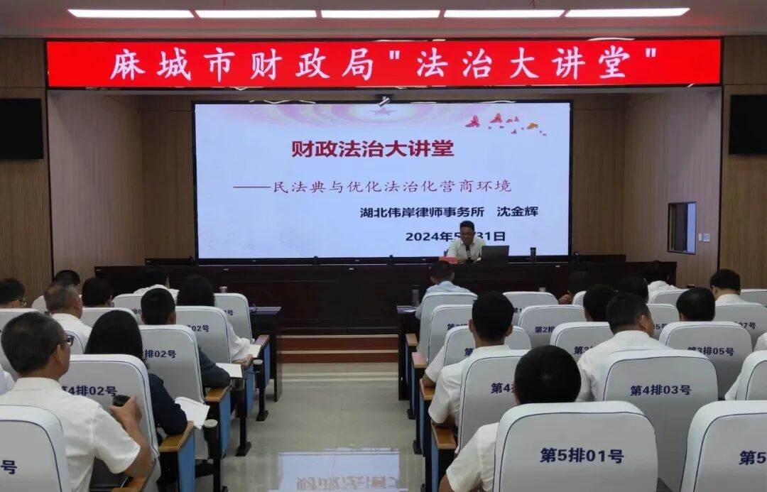 5月31日,市财政局“法治大讲堂”开课,邀请湖北伟岸律师事务所沈金辉律师进行《民法典与优化法治化营商环境》专题讲座。