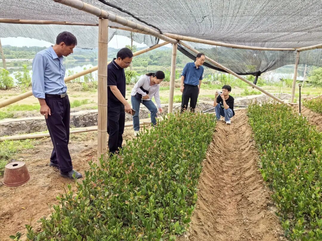 6月4日,省林科院经济林所副研究员杜洋文、省林业科技特派员向珊珊副研究员等专家一行,到五脑山林场国家油茶良种基地进行实地调研。