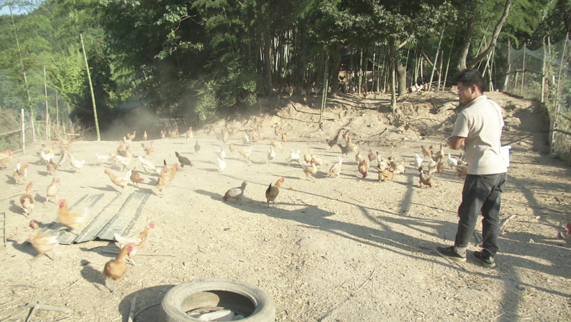 2022年9月,夫妻俩投资10万多元,购买了500多只小鸡,把竹林围成了鸡舍,购买了饲料加工设备,种了6亩地的玉米、小麦。夫妻俩每天早上6点起来打玉米、喂鸡、捡鸡蛋、发快递、做直播,还要抽空接送大孩子到山下上学,小孩子只好放在地上玩沙子,一边干活一边照看小孩子,十分辛苦。