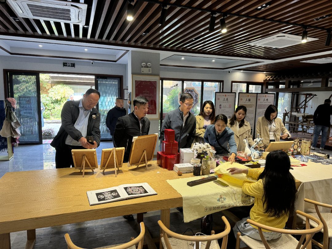 据了解,东山问梅村位于大别山南麓,整个项目以特色仿古主题客栈组群建成,古色古香,业态丰富。项目由湖北文旅集团黄冈公司与黄梅县政府合作,总投资33亿元,以国家级非遗文化IP为抓手,打造“华中最大文艺小镇”。考察组一行深入了解了黄梅戏、挑花等国家级非遗落地转换为文创产品的具体模式,探讨了东山问梅村的投资理念、运营模式等。