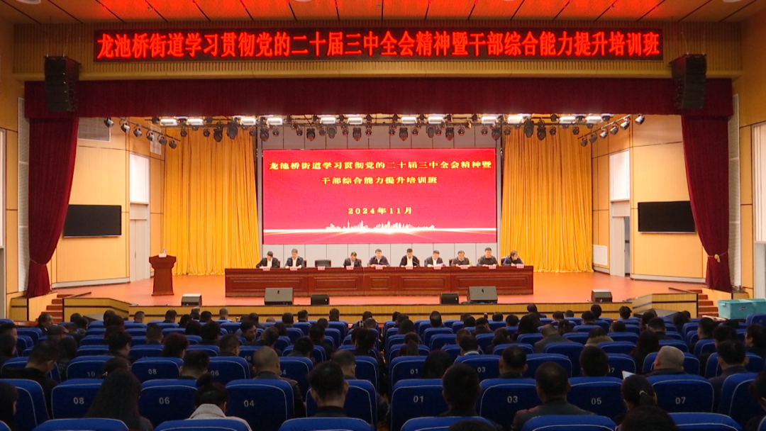 11月23号,龙池桥街道学习贯彻党的二十届三中全会精神暨干部综合能力提升培训班在市委党校开班,全面学习贯彻习近平新时代中国特色社会主义思想和党的二十届三中全会精神,深入贯彻落实各级全会决策部署,以建设高素质、专业化干部队伍为目标,教育引导街道全体党员干部统一思想、凝聚共识、深化认识,自觉站位全局,主动融入服务全市工作大局。