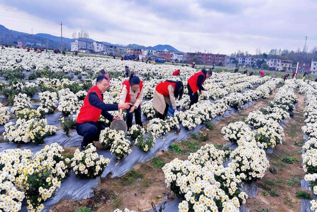 立冬时节菊花艳,菊蕊飘香惹人怜。位于黄土岗镇106国道一侧的堰头垸村,数百亩菊花千姿百态,竞相绽放。在这片花海中,菊农们与来自黄土岗镇财政管理所的党员志愿者正穿梭其中,灵活的手指不停地在花瓣上飞舞,不一会儿,小小的福白菊便装满了整个筐篓,这繁忙热闹的丰收景象展现出财政工作的别样“丰”采。