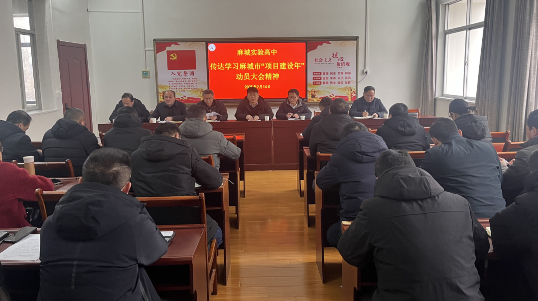 2月14日,麻城实验高中召开专题会议,传达学习全市“项目建设年”动员大会精神。会议要求,全校上下要深刻领会“项目建设年”的重要意义,切实把思想和行动统一到市委、市政府的决策部署上来。要以高度的责任感和使命感,主动担当作为,齐心协力抓好教育教学质量。要扎实做好教学计划,认真打磨学科规划,扎实开展教学研究,牢牢守住德育安全生命线,奋力谱写学校高质量发展新篇章,以优异成绩为麻城市高质量发展添砖加瓦。(王建军 陈小丽)