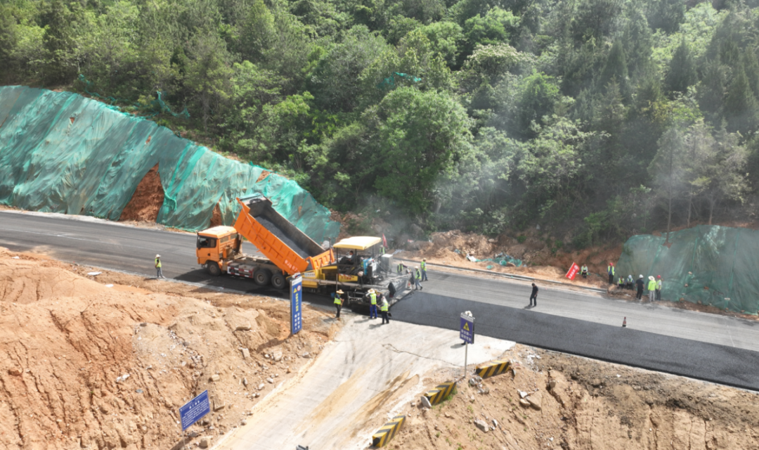 5月7日,在国道G220项目麻城段建设现场,摊铺机正在进行沥青路面的摊铺作业,据麻城交通局公路事业发展中心介绍,道路的沥青层摊铺施工已全面展开,施工方还投入了机器设备80余台,150余名工人,同步进行道路路基、桥梁,以及一些附属工程的施工。