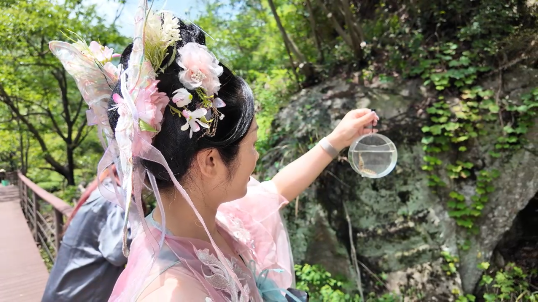 活动中,选手们在指定观景台拍摄汉服宣传素材,展现古典文化与自然风光的和谐之美。随后,她们在景区溪流浅滩区的环保钓点,使用拟饵进行限时垂钓,所有钓获均现场统计成绩后立即放流,践行“绿色垂钓”理念。