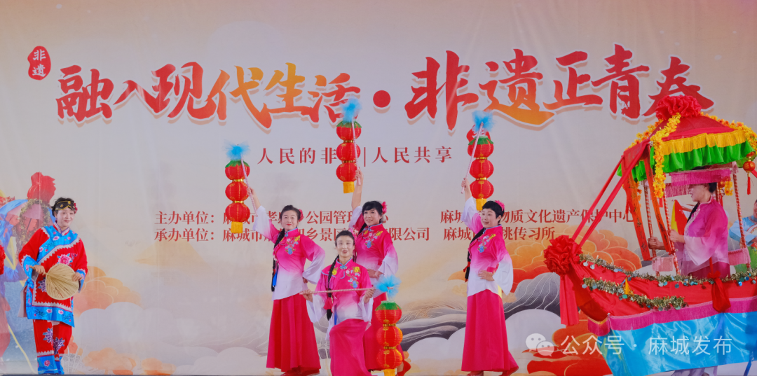 演出在热闹喜庆的民俗表演采莲船《欢迎你到麻城来》中拉开帷幕,灵动的彩船、欢快的鼓点,瞬间点燃现场气氛,传递出麻城人民的热情好客。黄梅戏《天女散花》经典唱段中,演员们用婉转唱腔重现传统戏曲的魅力;麻城花挑《唱个兄妹在桃园》、莲湘舞《欢乐莲湘打起来》、车马灯《麻城杜鹃红满天》、独唱《龙船调》等极具地域特色的非遗节目,将民俗文化与传统技艺巧妙融合,尽显麻城非遗的独特韵味。