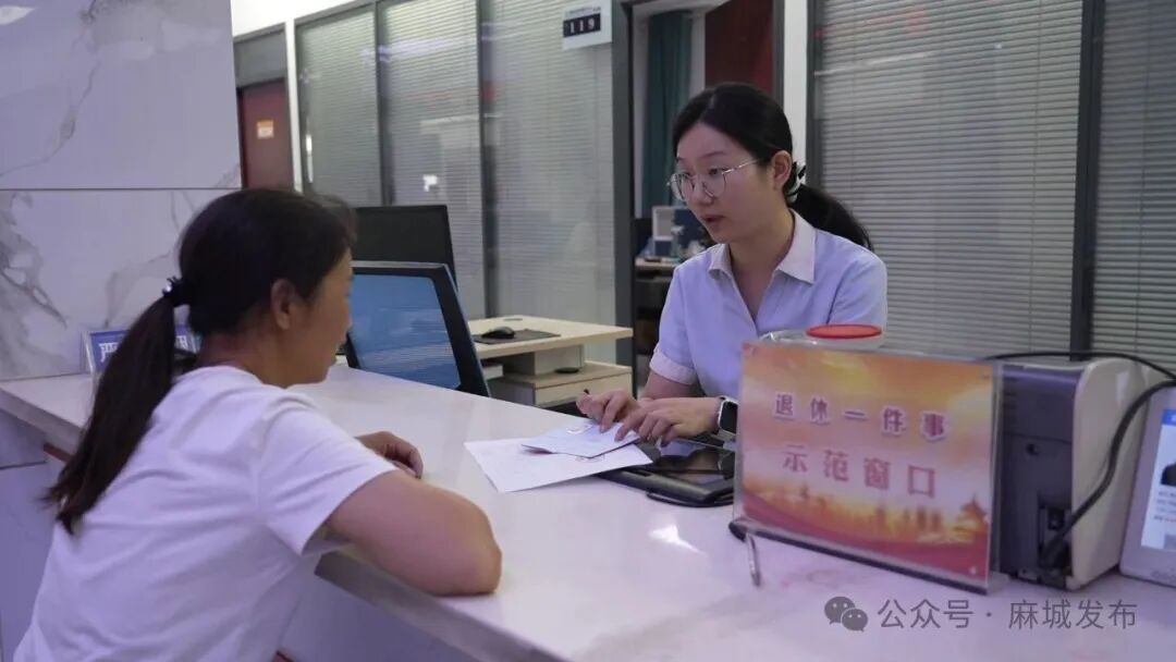 办理退休手续涉及养老金计算、医保、公积金等部门业务,流程多。麻城政务服务中心人社窗口对内优化养老待遇认证业务流程、整合高频业务窗口,建立“申请受理—资料预审—审批经办—养老待遇计算—待遇信息告知”小时办结模式,最大限度压缩办理时限。