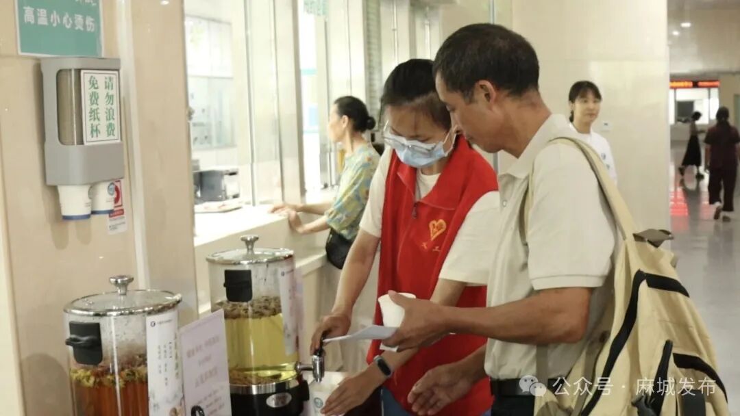 中药特色茶饮放置在市人民医院门诊大厅取药等候区,供就诊患者及家属免费饮用,还标注着详细配方和适用人群。一杯杯茶饮散发着浓浓中药香,吸引不少就诊患者及家属纷纷前来品尝。
