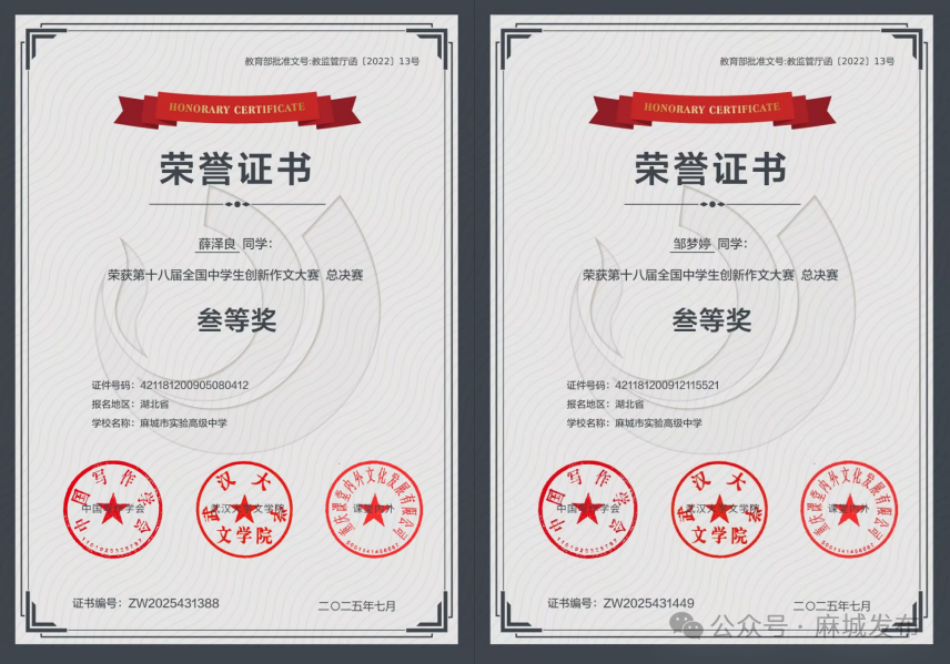 据悉,本届大赛由教育部批准、中国写作学会主办,武汉大学文学院等单位承办,吸引了全国超过140万名高中生参与,竞争极为激烈。麻城实验高中学子在本届大赛中表现亮眼,成绩斐然,累计超500人次斩获各级奖项:初赛阶段,495名同学荣登榜单;省级决赛,54名同学再奏凯歌(一等奖2名,二等奖8名,三等奖44名)。薛泽良和邹梦婷同学作为省级决赛一等奖的佼佼者,成功挺进全国总决赛。(李聪 陈小丽)