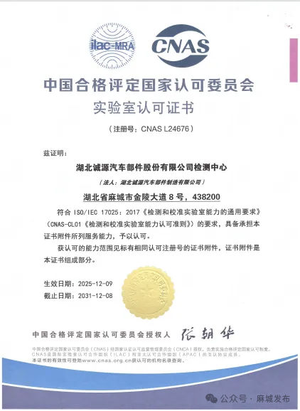 近日,麻城重点汽车零部件企业——湖北诚源汽车部件股份有限公司检测中心正式获得国家级CNAS实验室认证。这不仅标志着企业检测技术能力达到国际互认水平,更彰显麻城持续赋能企业创新发展、推动产业提质增效的显著成效,为本地企业产品走出国门、进军国际市场筑牢关键技术保障。