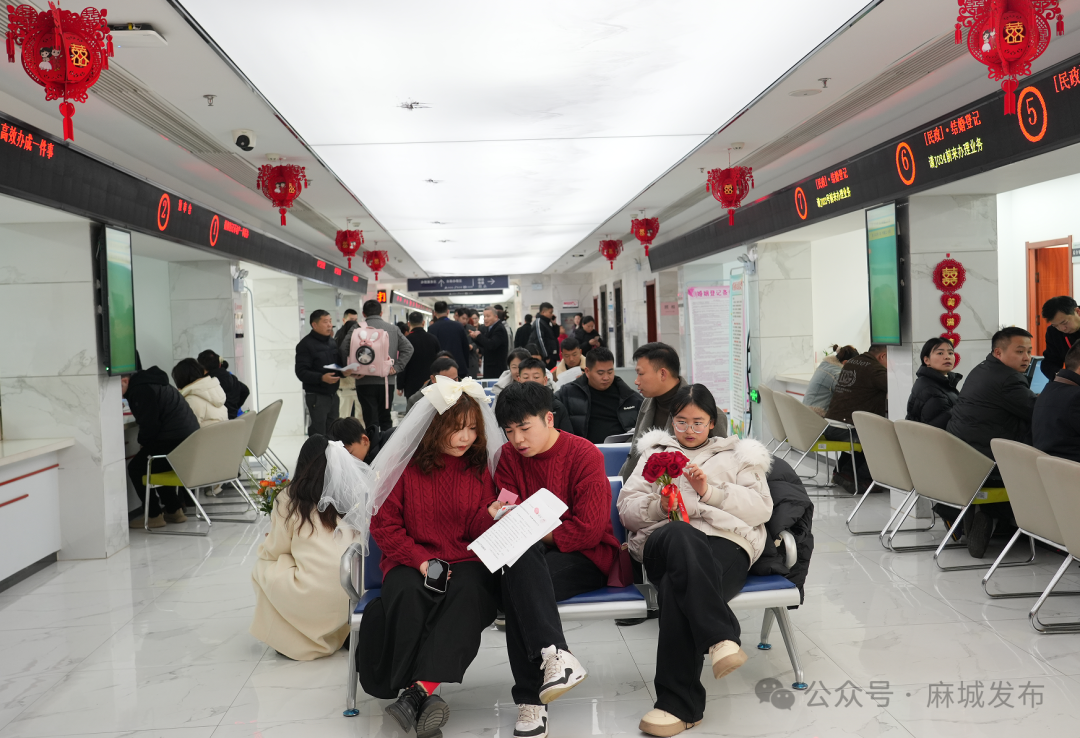 为应对登记高峰,麻城民政部门提前在“鄂汇办”平台开放预约通道,增派人员并延长服务时间,确保即来即办。现场还精心准备打卡墙、婚纱、捧花、鲜花等氛围道具,为新人营造温馨浪漫的登记体验。同时,现场通过海报等形式开展“倡导文明婚俗,弘扬时代新风”主题宣传。市妇幼保健院提供免费婚检服务,政务服务中心志愿者全程引导,保障新人享受便捷、温暖的一站式登记服务,顺利领取象征幸福的“红本本”。