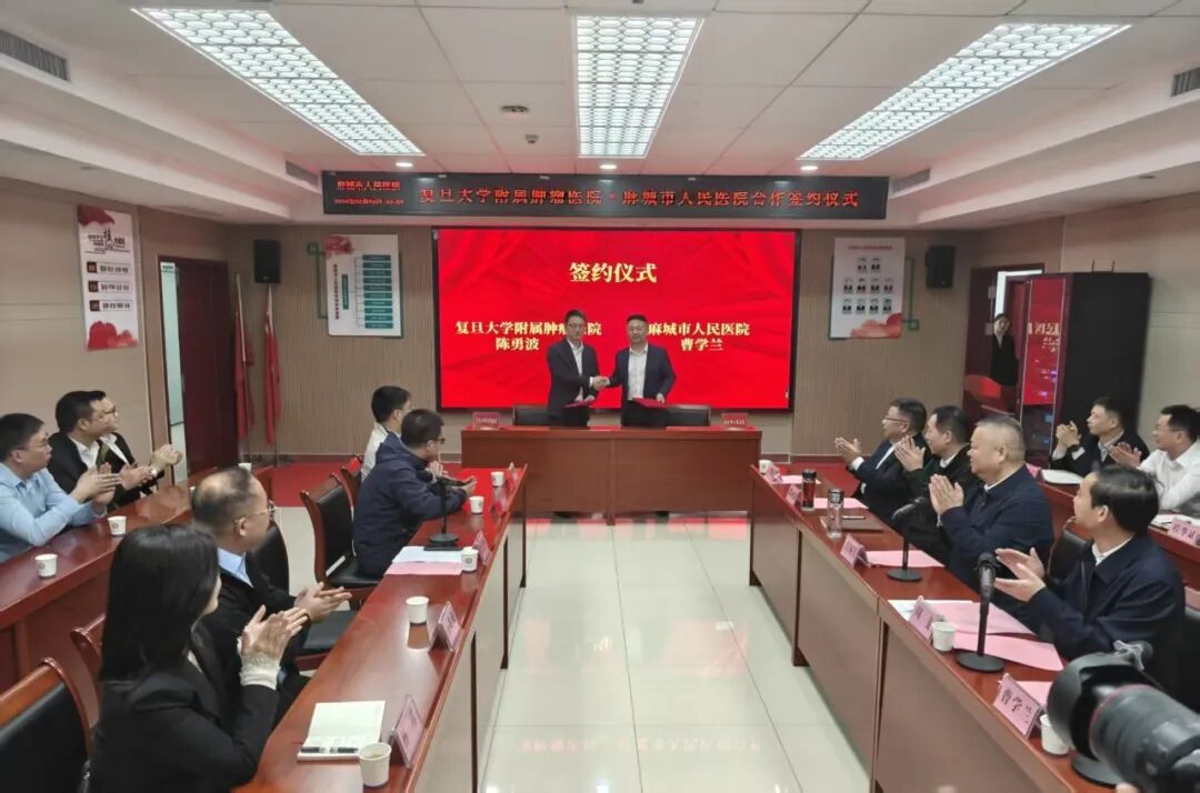 4月26日,复旦大学附属肿瘤医院与麻城市人民医院签订合作协议,携手共建麻城市肿瘤防治中心。市委书记汪国兵出席签约仪式并致辞,复旦大学附属肿瘤医院外联发展中心、外联办公室主任陈勇波出席活动。